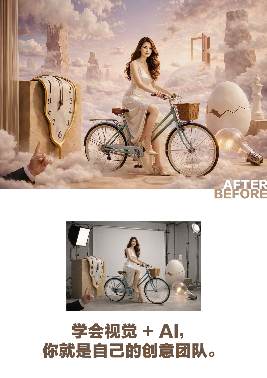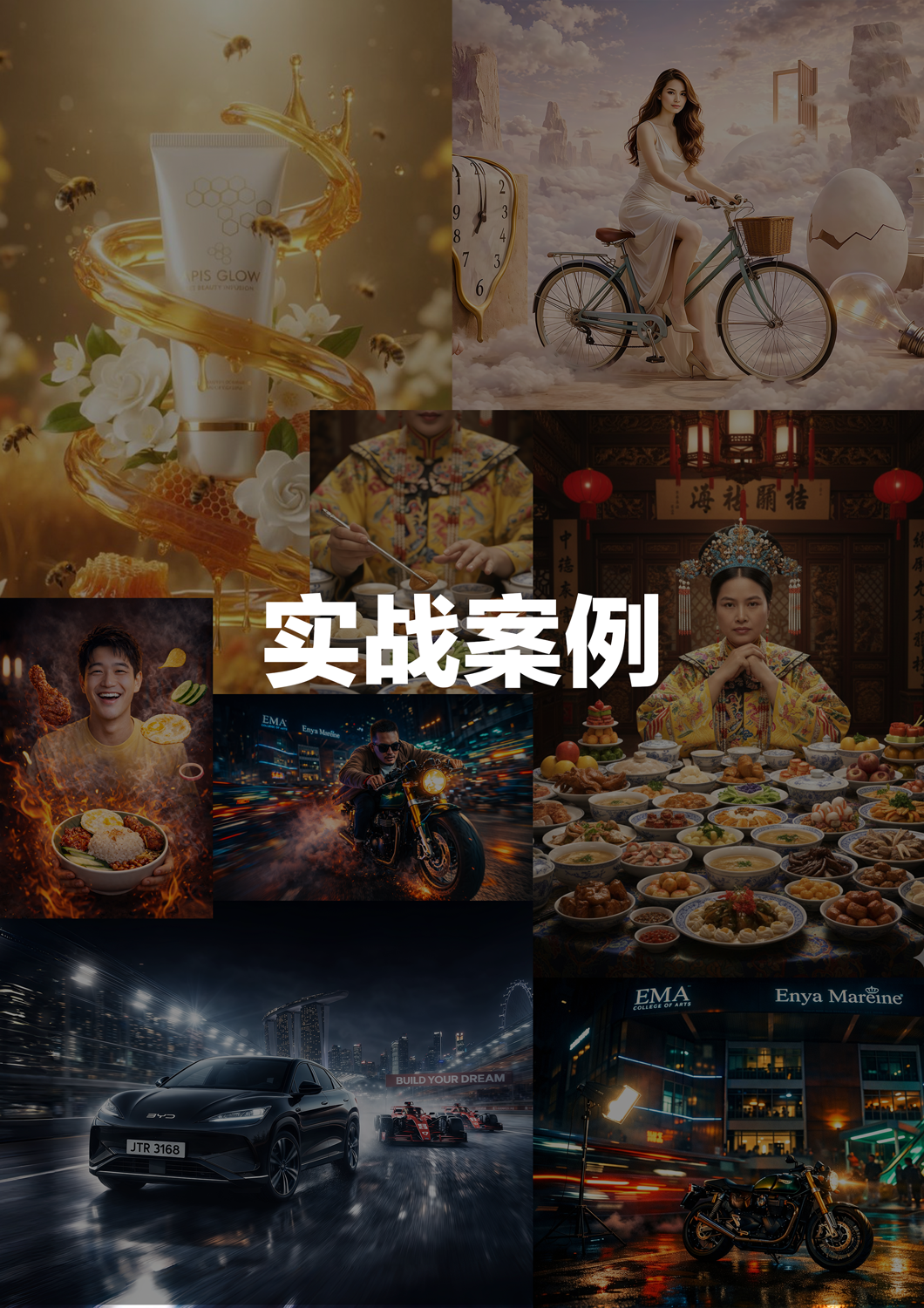 • AI Prompt 写作技巧• 如何与 AI 对话• AI 画面风格控制• AI 产品画面生成• 广告级产品视觉制作• AI 人物与场景生成技巧